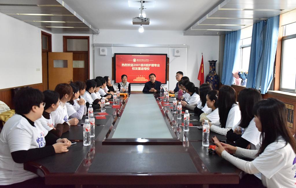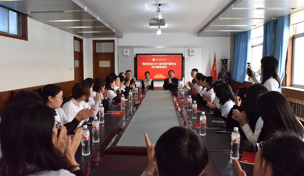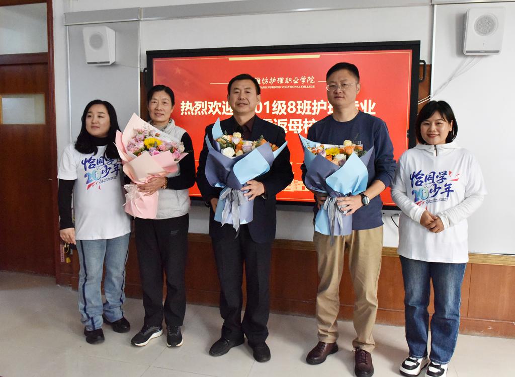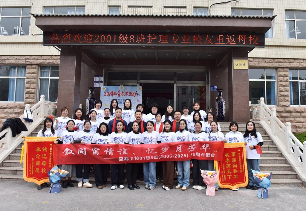 2025年10月19日,学院(原益都卫校)2001级8班近30名校友怀着对母校的深切眷恋与同窗情谊,从山东各地重返校园,共赴一场跨越20年的青春之约,圆满举办毕业20周年返校聚会。学院党委委员、副院长窦忠伟出席活动并致辞,招生就业处、口腔系、中医系及安全保卫处等部门通力协作,为聚会提供了全方位保障。